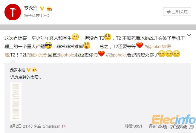 對于這篇文章,更多用戶更關(guān)心是T2手機什么時候亮相,對此羅永浩也是給出了一些答案,其表示T2不顧死活地挑戰(zhàn)并突破了手機工程上的一個重大難題,但非常非常難做,想要這款手機的朋友還要在等等。