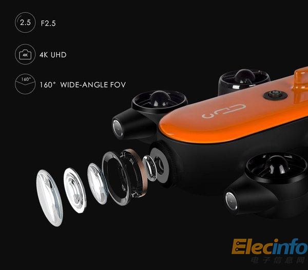 泰坦配備有4K攝像鏡頭,能夠拍攝高清視頻和圖片,前置3000lm LED補光燈,能夠下潛至150米的深海。機身四周分布有4個垂直推進器和2個水平推進器,使其在水下能夠自由移動并保持穩定性,可以有效實現360度全姿態控制,速度能達到2m/s。內置專用圖像處理DSP,可用于圖像識別,物體追蹤等智能應用。