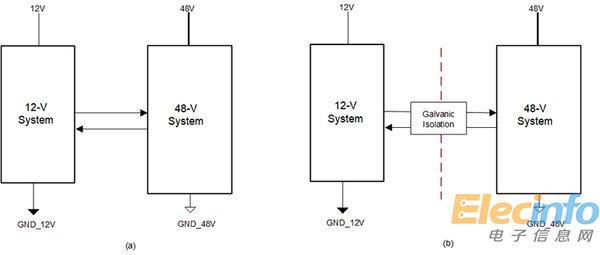 圖1. 12V和48V系統之間的直接和電隔離連接