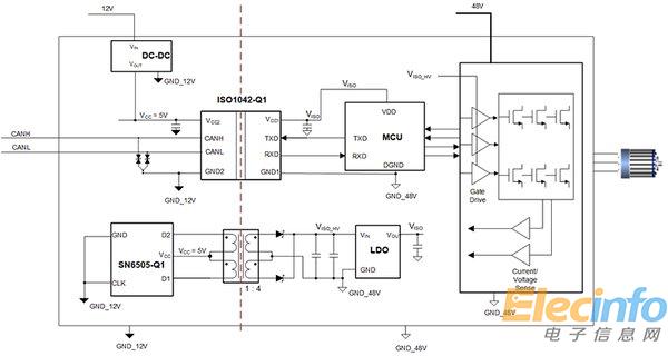 圖3. 這款48V啟動發電機采用隔離式CAN收發器和推挽式隔離電源