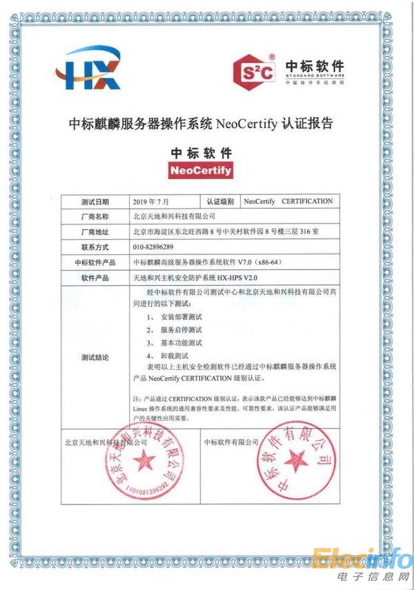 近日,中標麒麟對天地和興主機安全防護系統 HX-HPS V2.0 進行兼容性測試,主要從安裝部署、服務啟停、基本功能和卸載四大模塊進行測試。測試結果顯示,HX-HPS V2.0 在中標麒麟服務器操作系統上順利安裝,運行良好,且整體系統功能正常,運行穩定,表示該產品的通用兼容性及性能、可靠性已經達到要求,能夠滿足用戶的關鍵性應用需要。天地和興成為工控安全領域首家通過中標麒麟測試認證的企業.