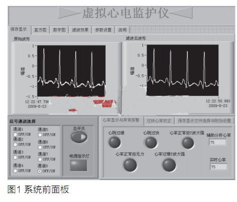 LabVIEW是一種基于圖形編程語言—G語言的可視化開發平臺,多被應用于儀器控制、數據采集、數據分析等領域[2] 。鑒于實際心電監護儀難以普及和虛擬儀器的強大優勢[3],我們采用LabVIEW的開發環境,設計了虛擬心電監護儀系統,實現了對心電信號進行采集讀取、濾波、保存和回放,自動計算心率并對異常心電給予報警。此心電監護儀可以實現長時間的數據保存,而且操作界面簡潔友好,便于掌握。