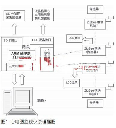 該系統(tǒng)中的傳感器用來檢測心電圖的微弱信號,再經(jīng)過放大濾波等調(diào)理之后進(jìn)行編碼,然后通過ZigBee無線模塊發(fā)送到基于ARM和ZigBee協(xié)調(diào)器模塊的網(wǎng)關(guān),通過外圍接口發(fā)送到上位機(jī)進(jìn)行顯示處理,然后通過以太網(wǎng)傳送給社區(qū)診所,診所再將每個(gè)人的信息通過ZigBee無線模塊返回給各自的家庭,并在LCD上顯示醫(yī)院反饋的處理信息。通過合理選擇芯片能夠?qū)崿F(xiàn)低功耗、低成本,檢測微弱的心電圖波形變化。