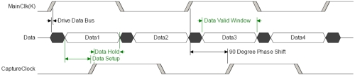 在同步存儲器系統例如QDR SRAM中,數據是與時鐘同步的,所以存儲器數據要使相位必須旋轉90度。這種相位旋轉通常在有效數據窗口中進行中心調整時鐘,是一個重要的QDR準確數據采集的設計特點(見下文圖2)。如果要改變時鐘中心,我們可以通過對板上FPGA的PLL網絡進行簡單的延時時鐘信號來達到。