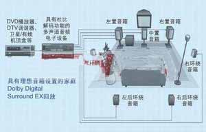 下面介紹一種典型的家庭影院環(huán)境,該環(huán)境擁有可在解壓縮及放大至適當(dāng)音量后再現(xiàn)多聲道音響效果的典型揚(yáng)聲器配置。在此特定情況下,解壓縮技術(shù)采用可提供8個聲道音頻內(nèi)容(7個聲道全帶寬音頻和承載超低頻的第八聲道)的Dolby Digital EX。為保持針對影院創(chuàng)造的攝影棚的設(shè)置,相對于視頻內(nèi)容將聲道提前或滯后,以確保聲音抵達(dá)聽眾位置后能與銀幕上的畫面同步。須注意的是,相對于公共影院而言,家庭影院環(huán)境中的揚(yáng)聲器數(shù)量要少得多。如果想要保持多維攝影棚的音效,則這種局限將使揚(yáng)聲器的布置變得極為關(guān)鍵。