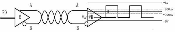 RS-485數據信號采用差分傳輸方式,收、發端通過平衡雙絞線將A-A與B-B對應相連。當線路A高于線路B電平(VA-VB> +200mV)時,接收端輸出為邏輯高電平(RO=1);當線路A低于線路B電平(VA-VB<-200mV)時,接收端輸出為邏輯低電平(RO=0)。當驅動器的輸入端邏輯電平為高(DI=1)時,線路A電平高于線路B電平;當驅動器的輸入端邏輯電平為低(DI=0)時,線路A電平低于線路B電平。見圖1。