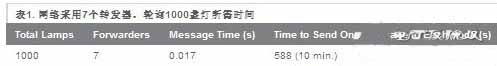 由于距離或變壓器產生的PLC信號衰減,集中器不能直接與每個節點進行通信。這種情況下,采用G3-PLC網狀架構,使每個節點成為轉發器,轉發集中器與每個節點之間的消息。本例采用了7個轉發器(表1),平均轉發延遲時間0.005s,采用單個集中器,集中器輪詢所有節點,集中器將一條消息發送至每盞燈的總時間為10分鐘。這一時間間隔允許經營者根據每盞燈的位置(例如:山坡上、地下通道內或低谷)點亮路燈或更改光度。即使必須控制全部路燈,最大延遲也只有10分鐘。如果需要將相同命令發送給所有路燈,例如緊急“打開”命令,可使用廣播命令,到達所有路燈的時間短于2s。