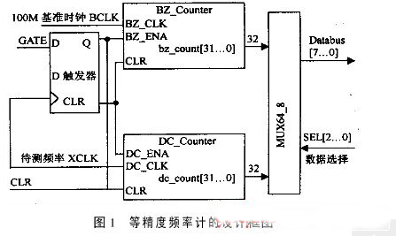 測(cè)量開(kāi)始,首選單片機(jī)發(fā)出一個(gè)清零信號(hào)CLR,使2個(gè)32 b的計(jì)數(shù)器和D觸發(fā)器置0,然后單片機(jī)再發(fā)出允許測(cè)頻命令,即使預(yù)置門(mén)控信號(hào)GATE為高電平,這時(shí)D觸發(fā)器要一直等到被測(cè)信號(hào)的上升沿通過(guò)時(shí),Q端才被置1,即使BZ_ENA和DC_ENA同時(shí)為1,將啟動(dòng)計(jì)算器BZ_Counter和DC_Counter,系統(tǒng)進(jìn)入計(jì)算允許周期。這時(shí),計(jì)數(shù)器BZ_Counter和DC_Counter分別對(duì)被測(cè)信號(hào)和標(biāo)準(zhǔn)頻率信號(hào)同時(shí)計(jì)數(shù)。當(dāng)Tc秒過(guò)后,預(yù)置門(mén)控信號(hào)被單片機(jī)置為低電平,但此時(shí)2個(gè)32 b的計(jì)數(shù)器仍然沒(méi)有停止計(jì)數(shù),一直等到隨后而至的被測(cè)信號(hào)的上升沿到來(lái)時(shí),才通過(guò)D觸發(fā)器將這2個(gè)計(jì)算器同時(shí)關(guān)閉。由圖2所示的測(cè)頻時(shí)序圖可見(jiàn),GATE的寬度和發(fā)生的時(shí)間都不會(huì)影響計(jì)數(shù)使能信號(hào)允許計(jì)數(shù)的周期總是恰好等于待測(cè)信號(hào)XCLK的完整周期,這正是確保XCLK在任何頻率條件下都能保持恒定測(cè)量精度的關(guān)鍵。因?yàn)椋藭r(shí)GATE的寬度Tc改變以及隨機(jī)的出現(xiàn)時(shí)間造成的誤差最多只有基準(zhǔn)時(shí)鐘BCLK信號(hào)的一個(gè)時(shí)鐘周期,由于BCLK的信號(hào)是由高穩(wěn)定度的100 MHz晶體振蕩器發(fā)出的,所以任何時(shí)刻的絕對(duì)測(cè)量誤差只有1/108 s,這也是系統(tǒng)產(chǎn)生主要的誤差。