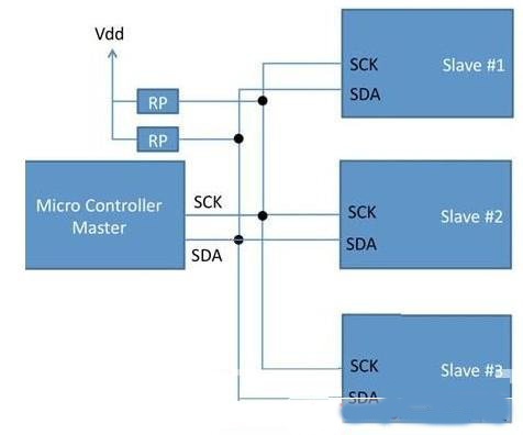 從物理學(xué)和電氣學(xué)的角度來看,SPI和I2C都是低開銷的總線標(biāo)準(zhǔn),一般從電路板實現(xiàn)的角度來看就很容易理解。I2C只需要兩個信號來實現(xiàn):SDA(數(shù)據(jù)線)和SCK(時鐘線)。這些線路都是漏極開路,并要求端接上拉電阻。這些連線可以跨越多個主器件和從器件,如圖1所示。該電路還需要的唯一一個額外要求就是使用適當(dāng)?shù)亩私由侠娮鑱硖幚砭€路電容。兩線總線上的多個主器件的問題需要使用總線仲裁來處理消息沖突。但是使用一個簡單的專用總線結(jié)構(gòu)和一個主器件,這些問題就可以全部解決。