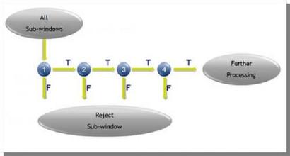 這種算法利用簡單特征的增強級聯,并且可以分為三個主要部分:(1)積分圖 - 用于快速特征評估的高效卷積;(2)使用用于特征選擇的Adaboost,并按照重要性順序對它們進行篩選。每個特征可作為一個簡單的(弱)區分器使用;(3)使用Adaboost來了解將最不可能包含面部的區域濾出的級聯區分器(弱區分器的集合)。圖2是區分器級聯的示意圖。在圖像中,大多數子圖像并不是面部實例。