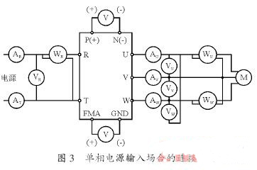 變頻器的電源側(cè)、輸出側(cè)的電壓、電流因?yàn)楹懈哳l成分,所以測(cè)量?jī)x表和測(cè)量回路不同,所得到的數(shù)據(jù)也是不同的。用工頻儀表測(cè)量時(shí),三相電源輸入場(chǎng)合的連接如圖2 所示,單相電源輸入場(chǎng)合的連接如圖3 所示。